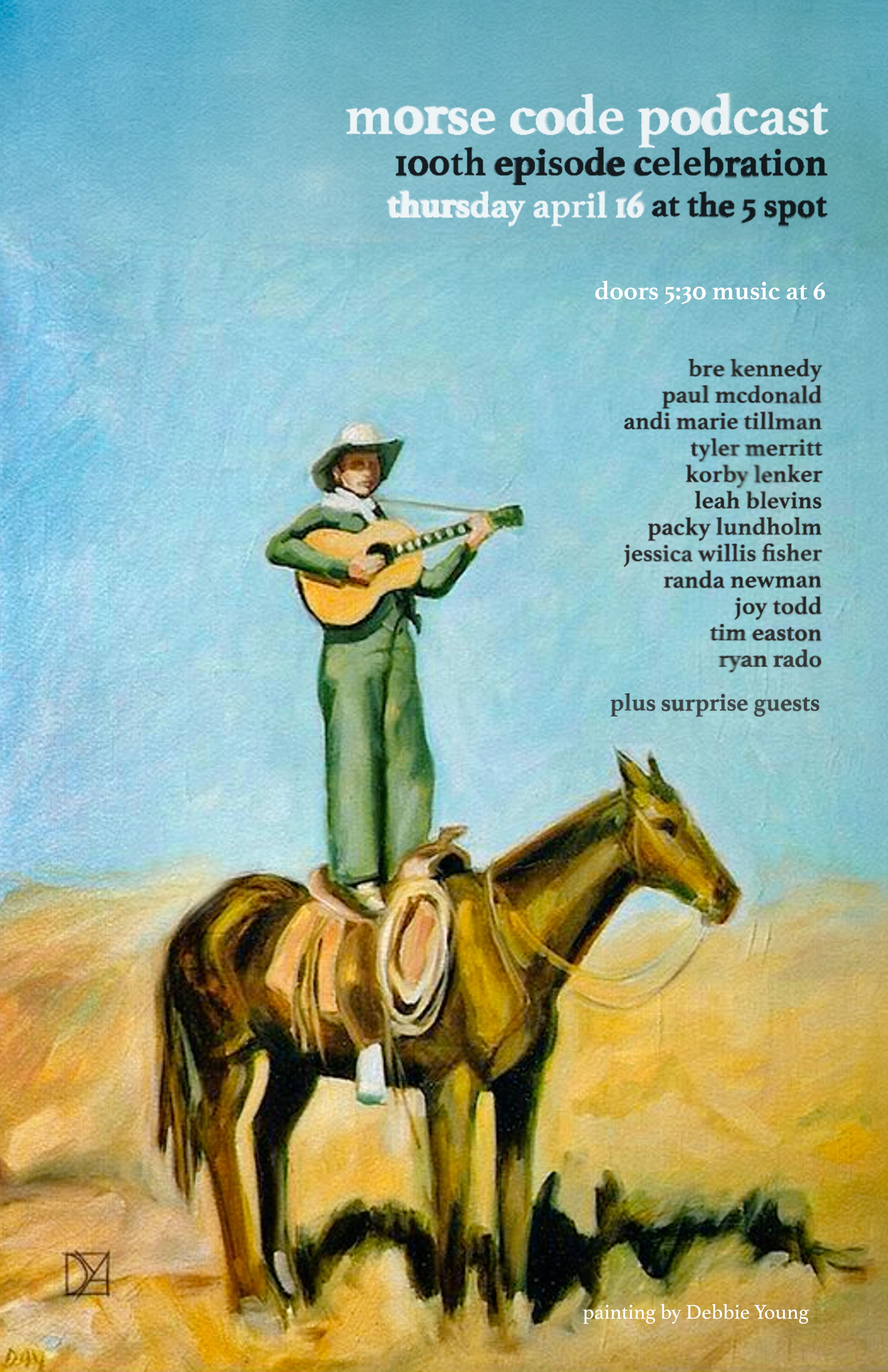 To that end, the 100 episodes end, I’m throwing a party for all of us at the Morse Code Podcast. We’re having a celebration show — live, one night only — at the 5 spot in East Nashville this Thursday April 16. Nice and early at 6p. We’ll have musical performances from several guests from the show, an author interview with Tyler Merritt, a short film screening from Joy Todd and Randa Newman, and live painting from Ryan Rado. If you’re within driving distance, I would men a lot to me if you came. Go here and buy a ticket. If this show if anything like the last one we did, it will be like young magic. Which is obviously the most potent kind.